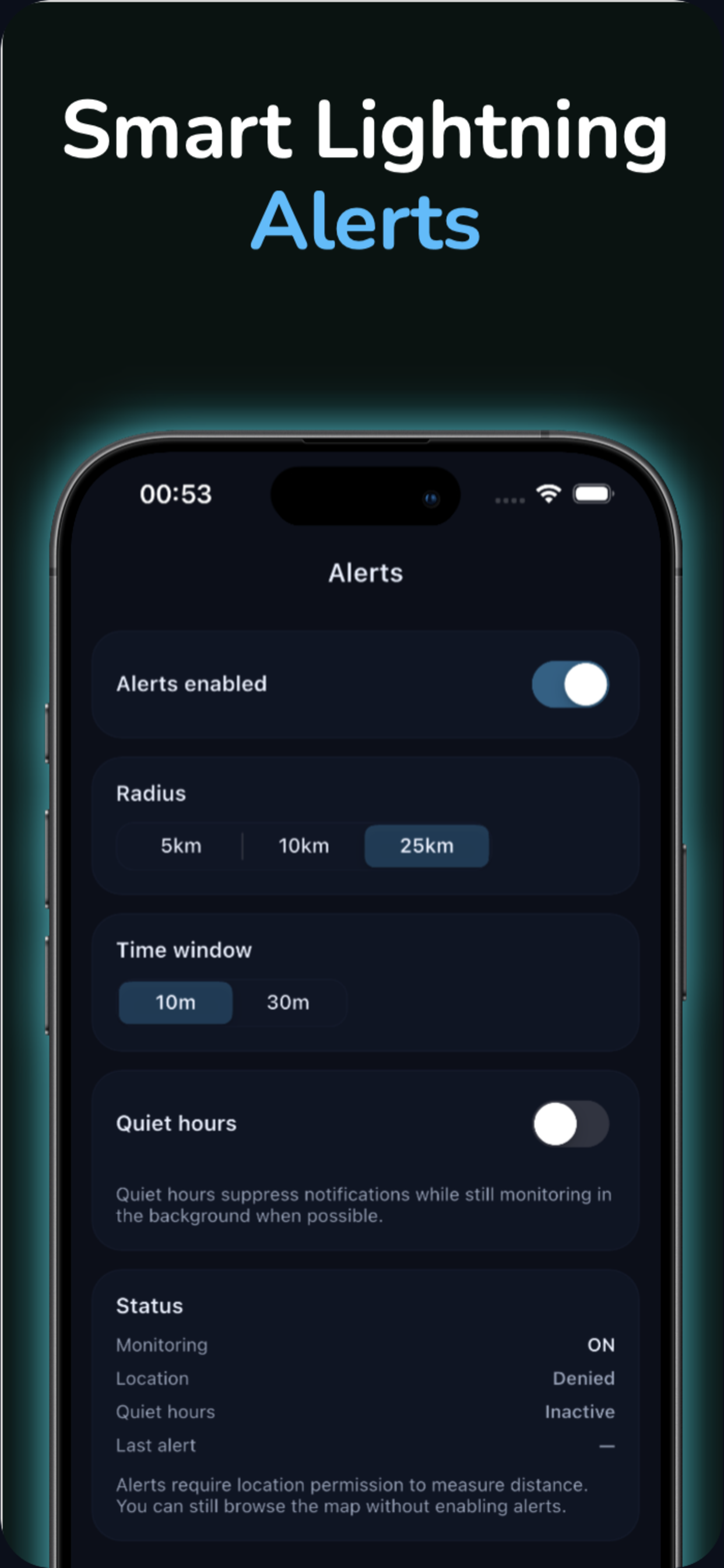 THUNDRA triggers local on-device notifications based on your alert radius and time window settings.